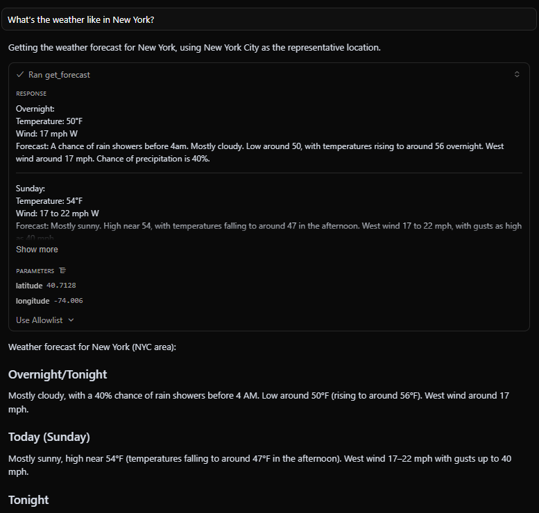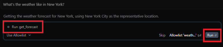 New York 주의 날씨를 질문하면 MCP tool을 선택하는 옵션이 나타나고,