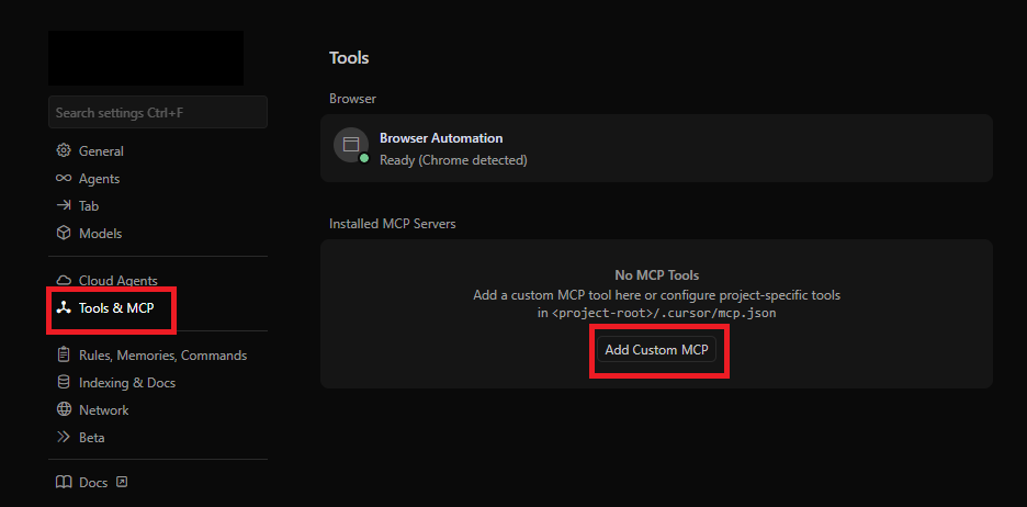 Cursor Settings > Tools & MCP 탭에서 Add Custom MCP 클릭