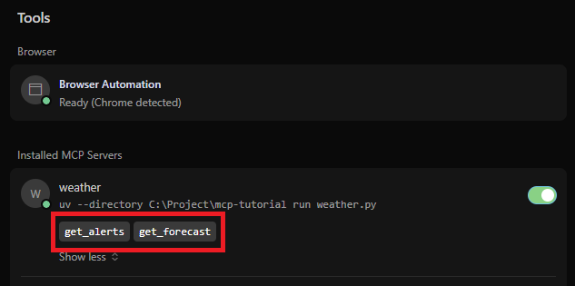 다시 Cursor Settings > Tools & MCP 탭에 들어가 보면 weather MCP와 tool로 등록한 두 개의 메소드가 보이는 것 확인