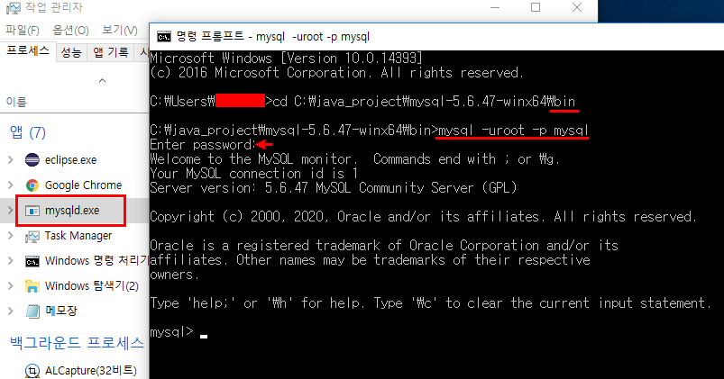 3. 구동파일을 연 채로 작업관리자를 확인했을 때, 프로세스에 mysqld.exe.가 올라와 있으면 정상적으로 작동하고 있는 것이다.