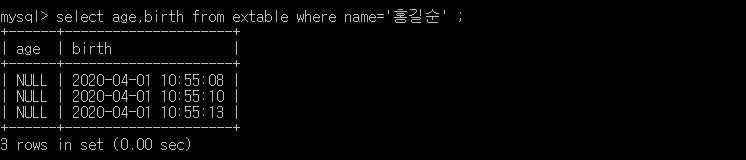 <예제> extable에서 이름이 홍길순인 사람의 나이와 생일을 출력하세요.