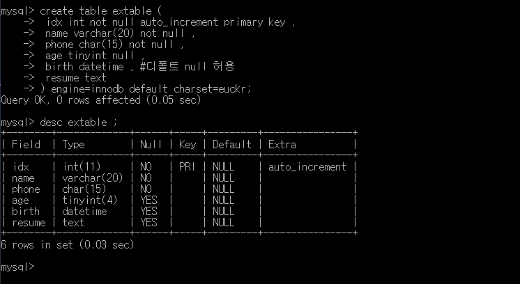 확인하기: desc extable ;(생성된 테이블 구조보기)