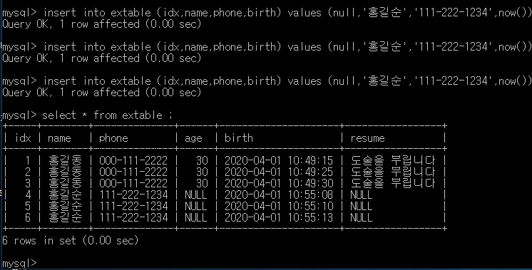 주의★ 컬럼 지정시 not null속성을 가진 컬럼은 생략이 불가하다(idx, name, phone -> 반드시 지정)★