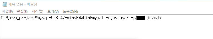 메모장에 MySQL 경로와 유저 이름, 패스워드를 작성해 bat파일로 저장한다.(root 접속 파일도 별도로 만들었다)