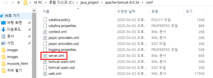 7. 압축을 해제한 폴더에서 conf 폴더 안의 server.xml을 실행한다.